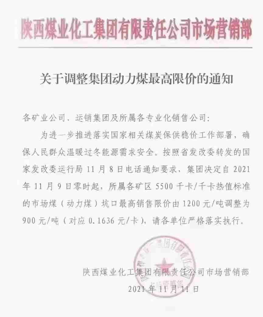 發(fā)改委運(yùn)行局11月8日電話通知要求,集團(tuán)決定自2021年11月9日零時起,所屬各礦區(qū) 5500 千卡/千卡熱值標(biāo)準(zhǔn)的市場煤(動力煤)坑口最高銷售限價由1200元/噸調(diào)整為900元/噸(對應(yīng)0.1636元/卡),請各單位嚴(yán)格落實執(zhí)行。